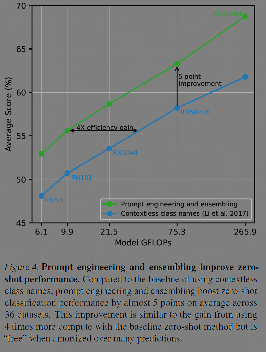 그림 1에서 설명한 것 처럼 프롬프트 엔지니어링과 여러 프롬프트를 조합하는 앙상블 방식에 대한 실험도 36개 데이터셋에서 진행했다. 이미지 인코더를 resnet 모델들에 대해 실험했는데, 개산량 관점에서 4배의 이득을, 평균 정확도 측면에서 5점의 개선이 있었다.