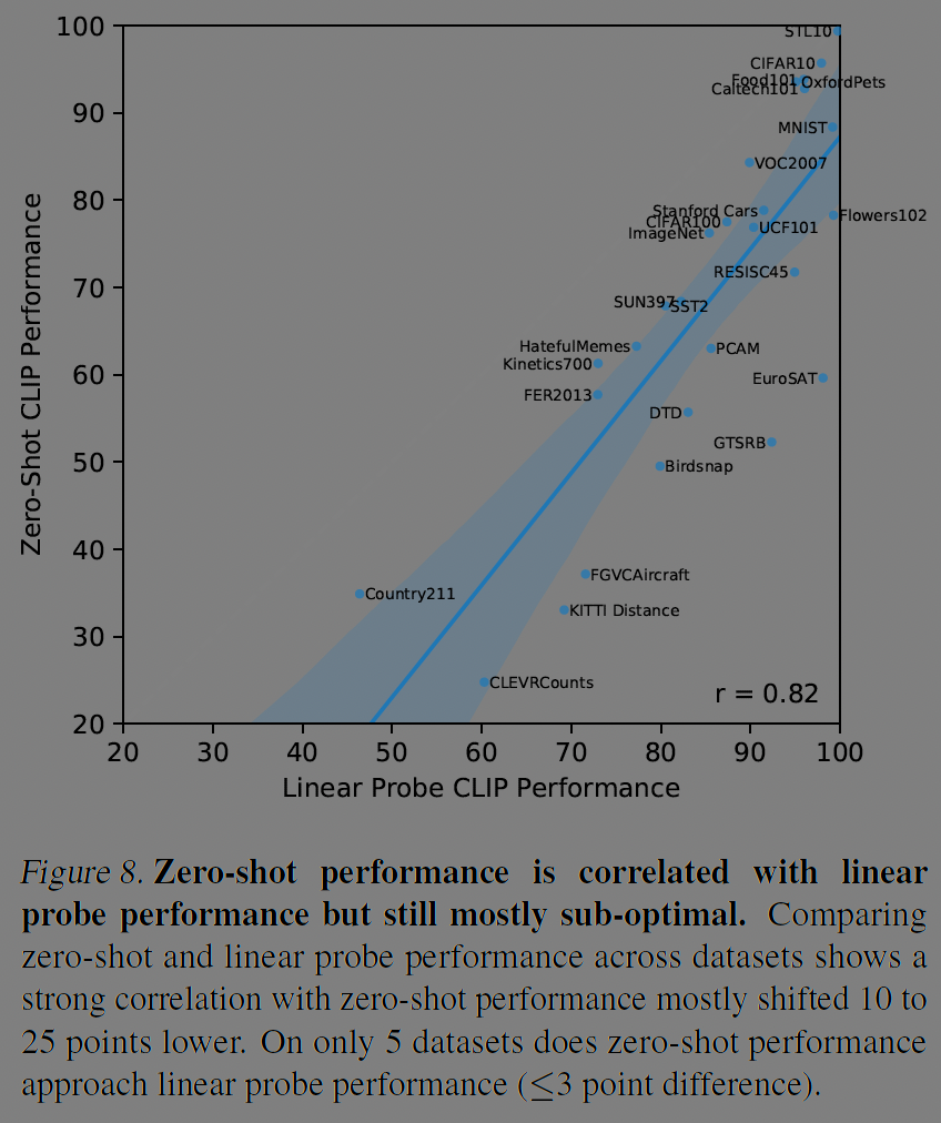 그림 8에서 CLIP 모델(y축)은 CLIP 모델에 선형 분류기를 추가(x축)한 것과 비교하였는데, 아무래도 제로샷 모델이 선형분류기를 추가한 것보다 y=x보다 아래로 성능이 낮긴하다. 그럼에도 0.82의 양의 상관관계가 있음을 알 수 있다.
