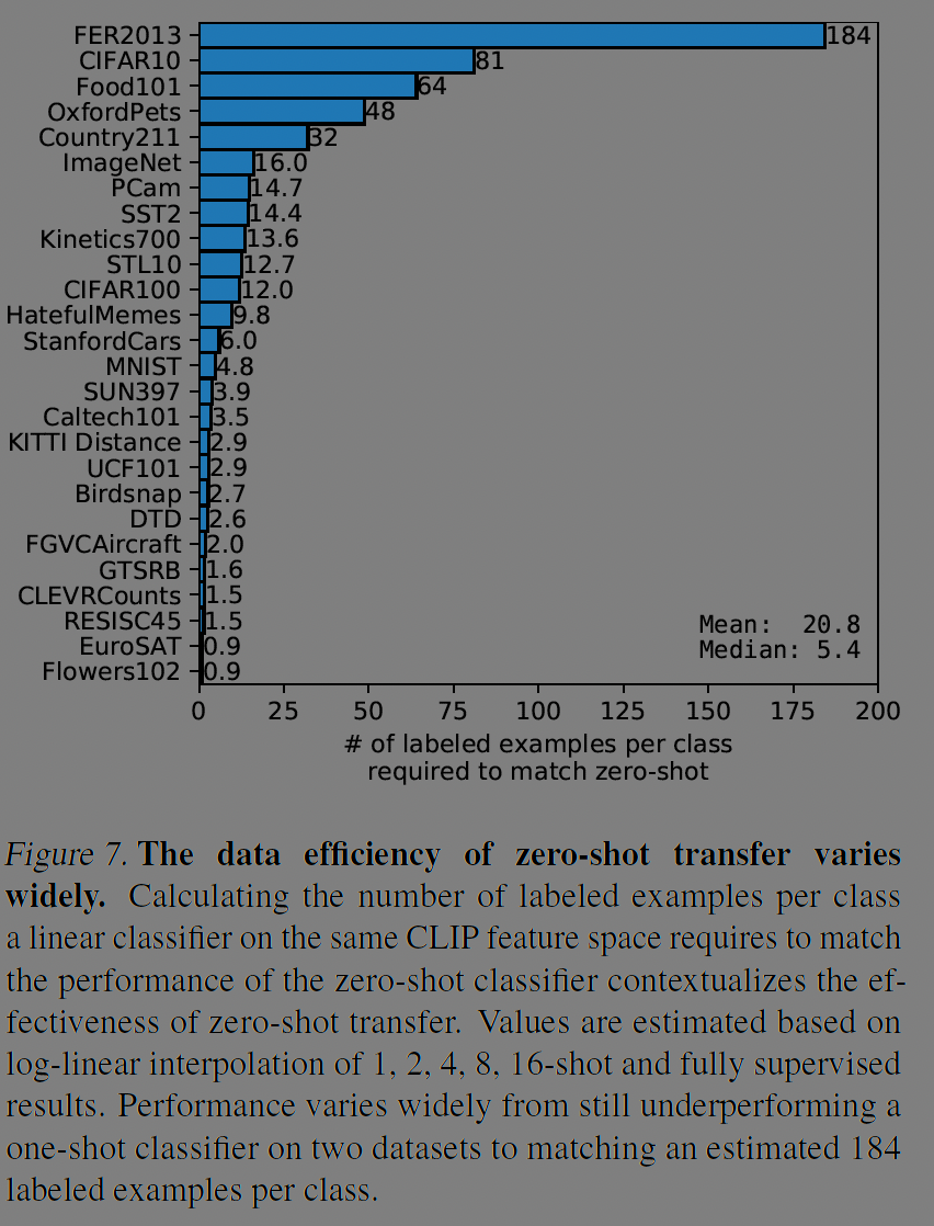 그림7의 결과로는 데이터셋 별로 CLIP의 제로샷 성능과 같은 성능을 내려면 얼마나 많은 샷을 학습시켜야 하는지가 나타난다. 평균적으로 20개의 샷이 필요하지만 편차가 매우 큰 편으로 그림 6의 실험과 같이 CLIP 모델은 일반적인, 대중적인 표현에 강점이 있음을 알 수 있다.