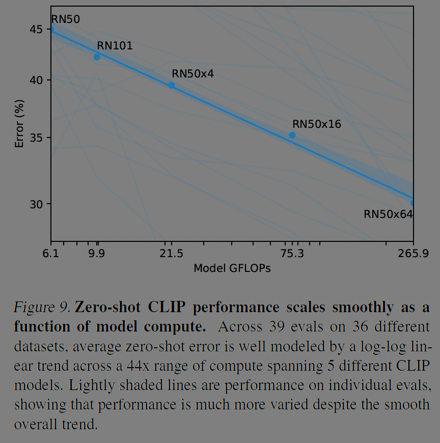 CLIP 모델은 zero-shot 성능이 매우 효율적이다. 그림 2를 보면, 이미지넷분류에서 언어 모델의 주류를 차지하고 있는 Transformer는 자연어처리 초창기 모델인 BoW 방식에 비해 3배나 비효율적이고 BoW는 CLIP보다 4배 비효율적이다.