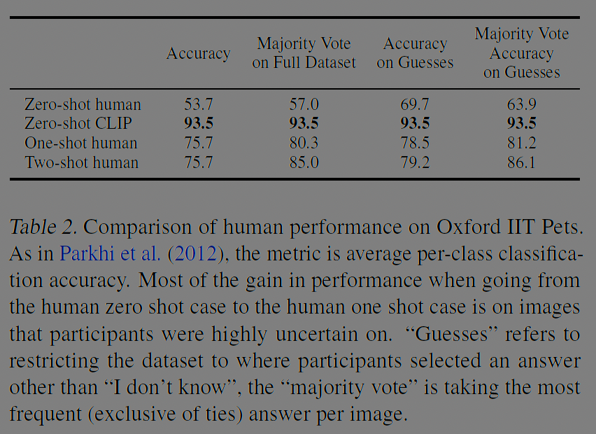 CLIP이 잘 못하는 것은 사람에게도 어려운 일이다. 사람의 경우 원 샷 러닝에 강점이 있다. 아예 못본 이미지를 한번이라도 보는 순간, 그에 대한 인식을 잘 하는 것이다. 반면 여러번 봐도 첫번째 본것 만큼의 인식 강화는 없다(표 2).