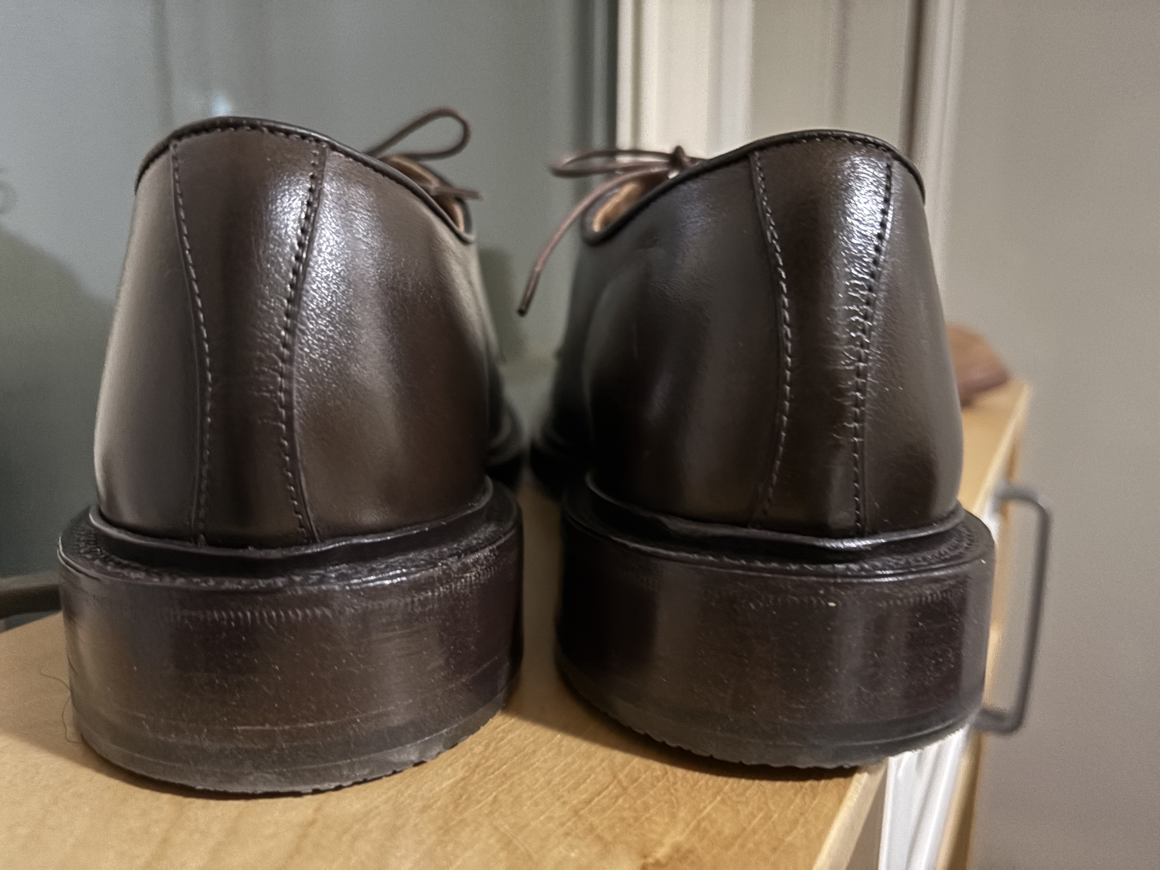 어두운 곳에서 사진을 찍어 검은 색상에 가까워 보이지만 잘익은 커피콩 색상의 더비슈즈이다. 로버트는 사진에서 보는 것 처럼 밑창의 부피가 큰편으로 스톰웰트 방식을 사용했고 이는 특유의 캐주얼한 분위기를 내는 요소이다. 작년에 유니페어에 방문했을 때 검은색 로버트 모델을 봤었는데, 캐주얼한 감성을 좋아하는 나로써는 알든 990보다 더 시선을 끄는 모델이었다.