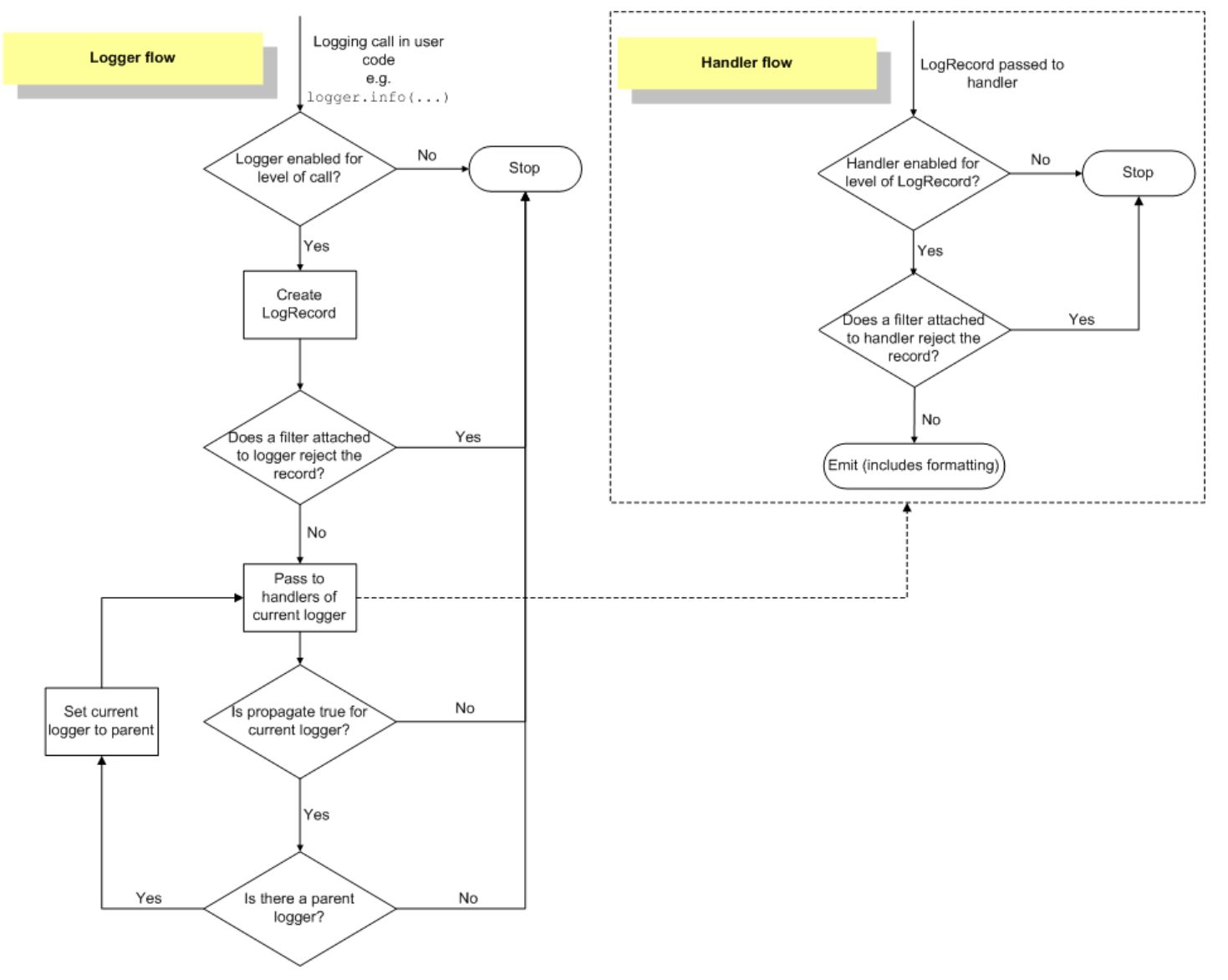 로깅 중 Handler 서브 클래스의 emit() 메서드 실행 중 발생하는 예외는 SystemExit과 KeyboardInterrupt 예외를 제외하고 handleError() 메서드에 전달된다. 로깅이벤트를 처리하는 동안 응용프로그램을 종료하지 않도록 위함이다.