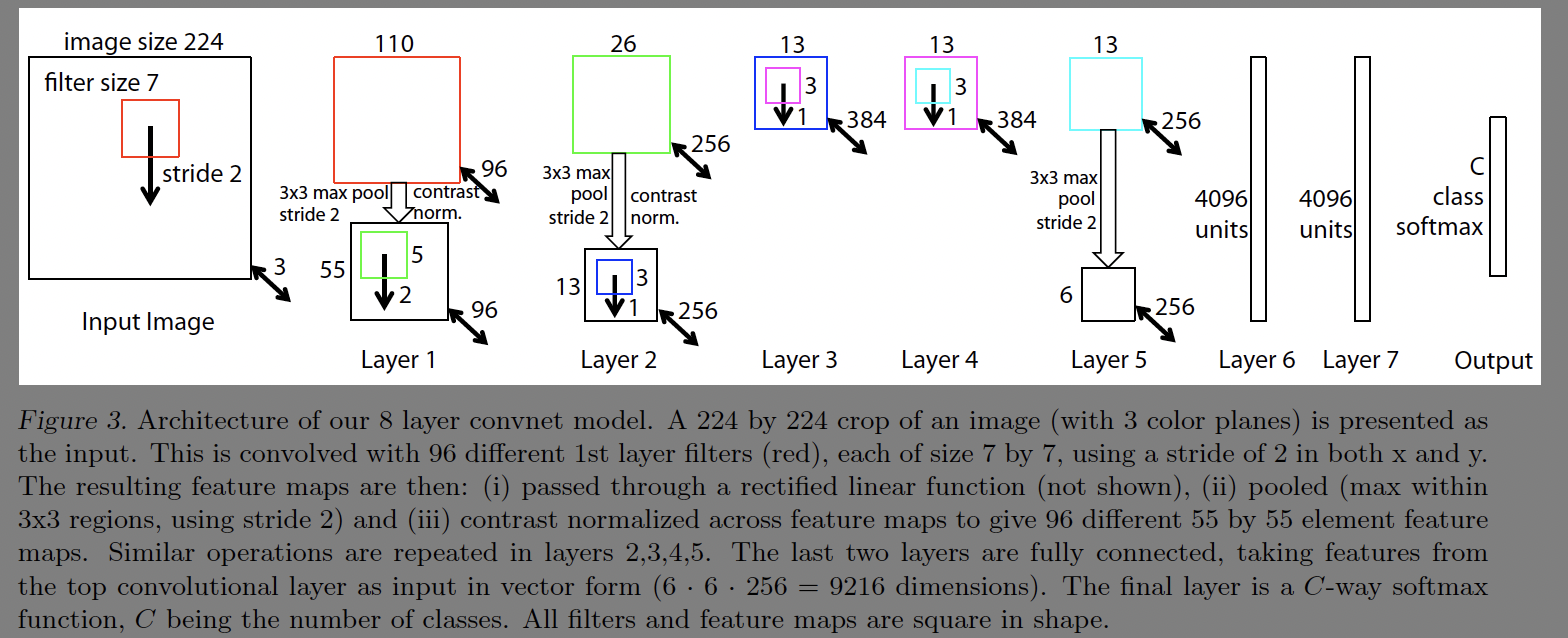 저자들의 이름 앞자를 따서 ZFNet으로 부른다. 피쳐 추출시 어떤 원리로 동작하는지를 이해할 수 있도록 시각화 기법을 도입하였다. 그리고 이미지넷2012 대회에서 우승한 Krizhevsky의 AlexNet보다 나은 성능의 모델을 제시한다.