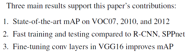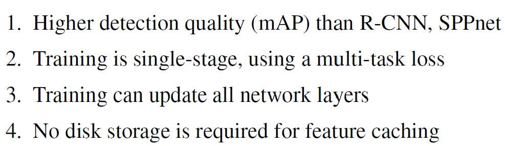 그리고 매 객체 검출 시마다 CNN 네트워크를 통과시켜야 했다. SPPnet에서는 sharing computation을 통해 테스트 시에 RCNN을 최소 수십배 가속하고 피쳐 추출도 세배 정도 빠르게했지만, multi-stage 학습과 디스크 용량이 많이 필요하다는 단점을 그대로 갖고 있었다.