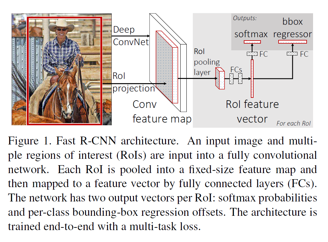 Fast RCNN 모델의 아키텍쳐는 아래 그림과 같다. 입력으로 전체 이미지를 받고 (no warp) CNN 층을 거쳐 컨볼루션 피쳐맵을 만들고 RoI 풀링을 통해 고정된 길이의 피쳐 벡터를 만든다. 그리고 피쳐 벡터를 클래스 분류, bbox 분류에 공통으로 사용한다. RoI 플링층에서는 맥스 풀링을 이용하는데, h x w 크기의 피쳐를 H x W 크기로 압축하는 역할을 한다. Sub-window를 계산하는 방식은 SPPnet의 only one pyramid level의 풀링계층과 같다고 한다.