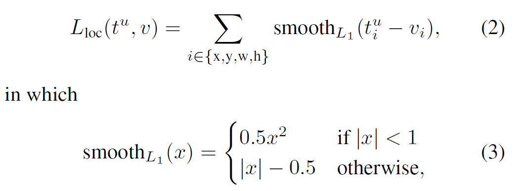bounding box regression에서는 아래의 손실함수(loss)를 사용한다. RCNN과 SPPnet에서는 L1 loss가 L2 loss에 비해 아웃라이어에 덜 민감하다(robust). 실험에서는 v_i를 0 mean, 1 variance로 표준화하였다.