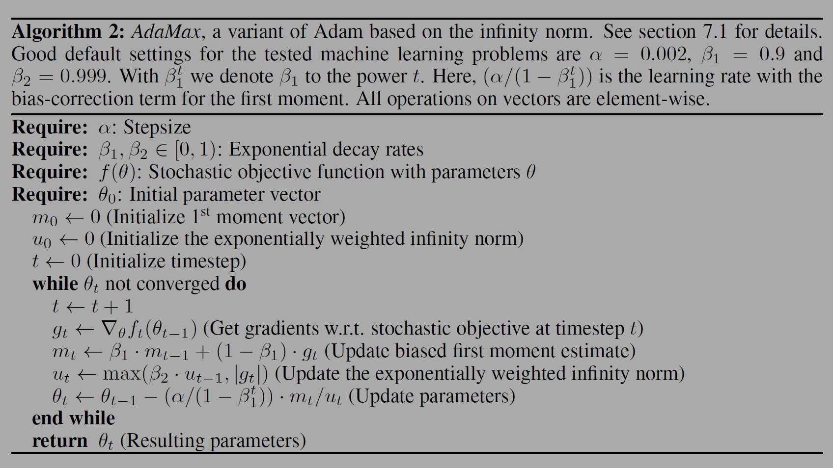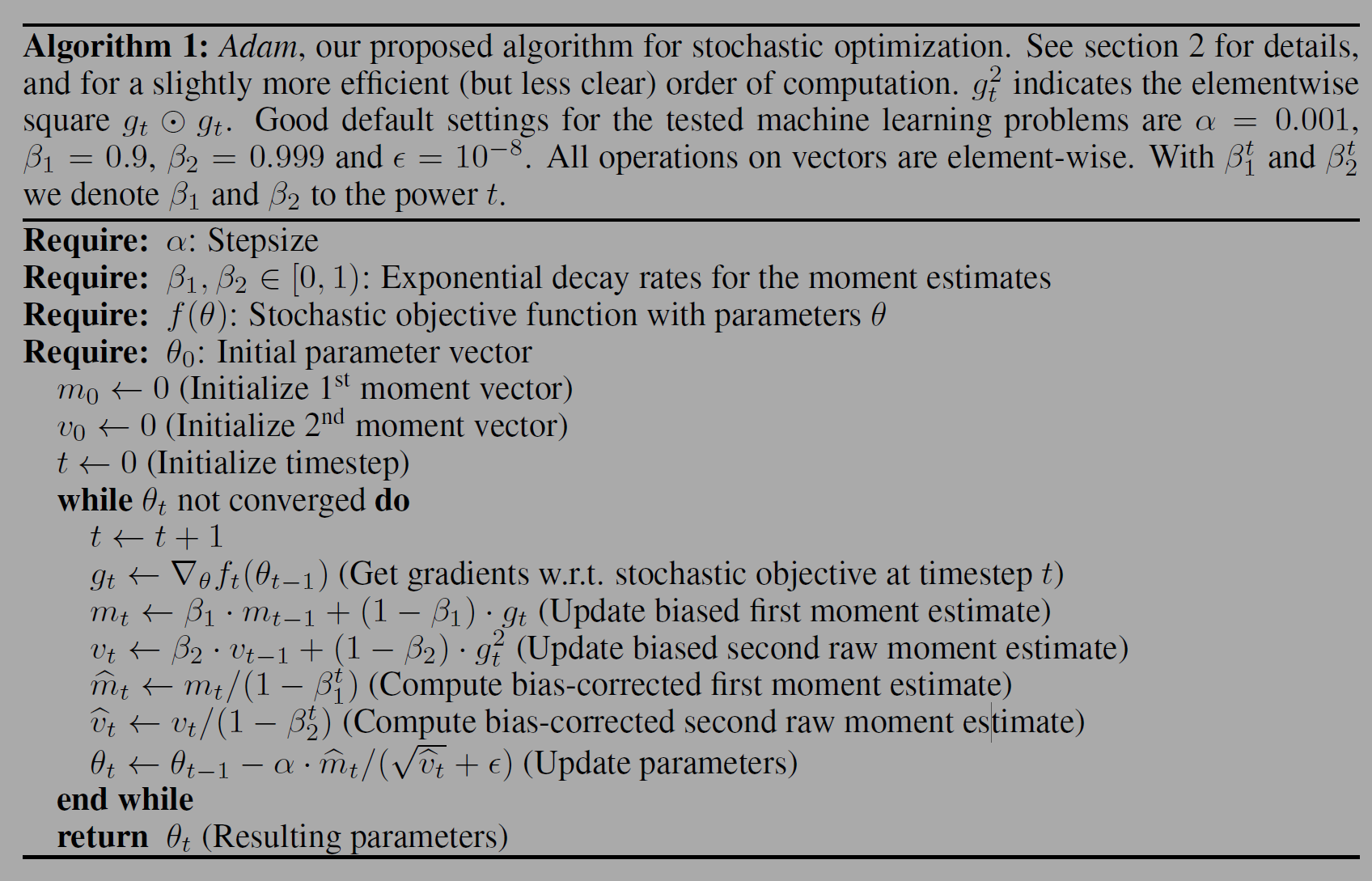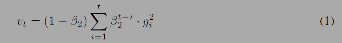 Algorithm 1의 v를 구하는 방식은 v_0이 0이기 때문에 초기편향 문제가 있어 수정된 위의 수식을 사용한다. 두 수식은 2 moment를 구하는 목적으로 같지만 편향이 수정되므로 더 정확하게 추정이 가능하다.