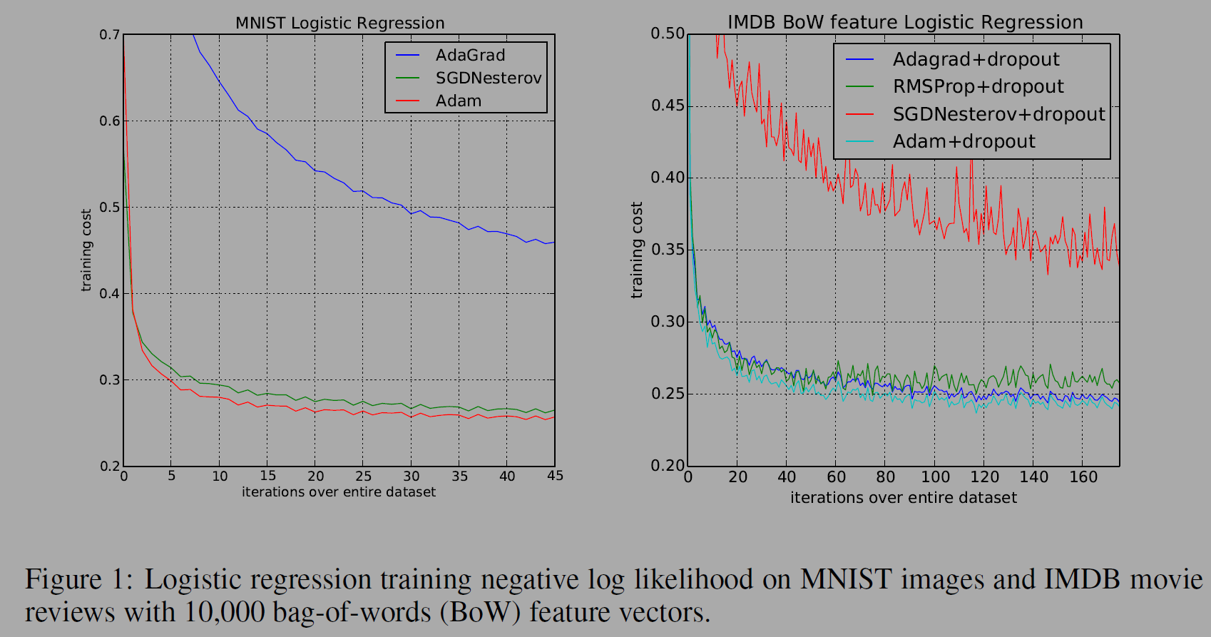실험은 MNIST 데이터셋과 IMDB BoW데이터 셋을 통해 이미지, 자연어처리에서 옵티마이저를 비교했다.