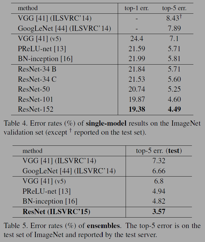 ResNet 단일모델(single model)과 앙상블(ensemble)모델에서의 실험결과는 아래 표 4, 5와 같다. ResNet A는 제로 패딩 shortcut이 ResNet B는 차원을 키우기 위해서 projection shortcuts가 사용되고 나머지는 동일하다(identity). ResNet C는 모든 shortcuts에서 projection을 한 모델이다.