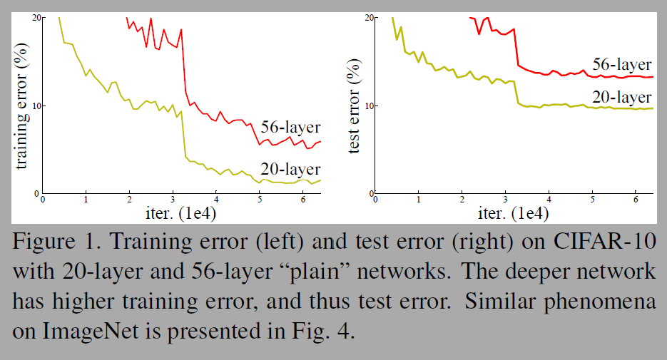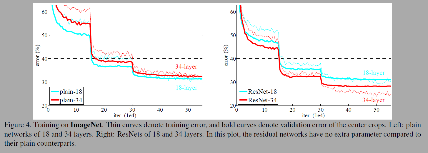 Figure 4의 ImageNet에서의 실험결과를보면 왼쪽의 plain net에서는 층이 싶어지면 에러율이 높아진다. 그러나 우측의 ResNets에서는 층이 깊어져도 에러율이 낮아진다.