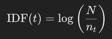 IDF(Inverse Document Frequency)는 단어 t의 역문서 빈도를 구하는 방법이다. 전체 문서에서 단어의 희귀도를 측정한다. 자주 등장하는 단어는 낮은 가중치를 받고 드물게 등장하는 단어는 높은 가중치를 받는다.