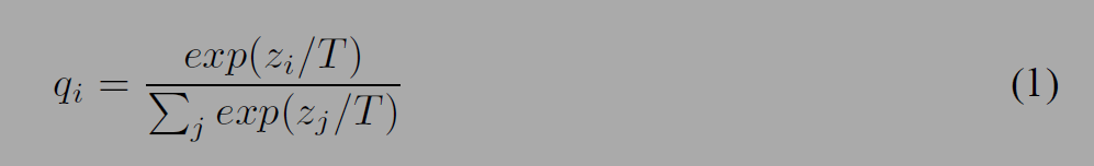 지식 증류를 위한 수식은 아래 그림과 같다. T 값이 1보다 커지면 클래스 i의 확률분포가 더 부드러워진다. 큰 모델과 증류모델을 학습할때 높은 온도(high temperature)를 사용하고 학습이 완료되면 1을 값으로 한다.