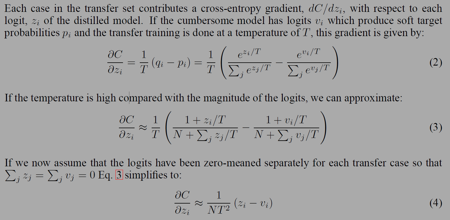 수식 2~4를 통해 로짓과 소프트 타겟의 관계에 대해 확인할 수 있다. 크로스 엔트로피 기울기는 각 증류모델의 로짓과 관련이 있는데(z_i), 증류모델의 크로스 엔트로피 결과 q와 큰모델 (cumbersome model, soft target사용)에 대한 크로스엔트로피 결과 p의 차이를 T로 나눈것과 같다(수식 2).